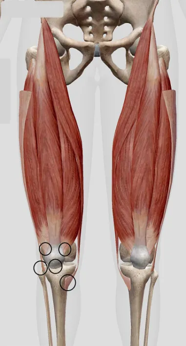 整個膝關節肌肉的生長路線上,任何一個地方能壓迫或拉扯肌肉纖維的地方,都能造成肌肉的問題出現。 但是並非要直接影響到肌肉,有些也能因為影響到包覆肌肉的筋膜,而造成近似肌肉損傷的症狀出現,進一步的使肌肉無法正常運作而有痛或無力緊繃等感覺。
