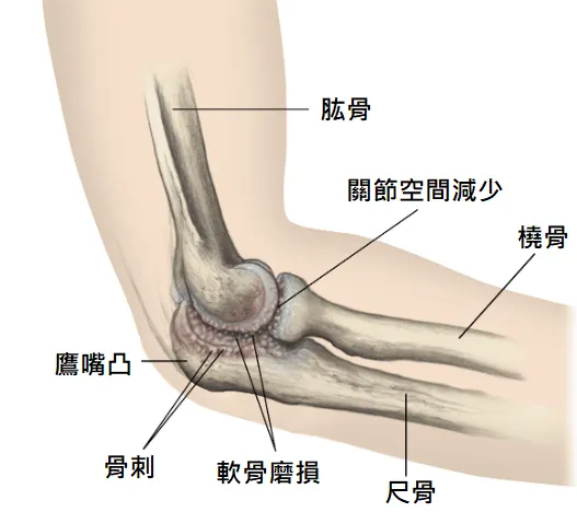 肘關節退化位於肘關節軟骨處,而退化錯位顧名思義則是骨骼磨損老化,即過度使用肘關節結構磨損於此關節等情形者皆屬於高風險族群。