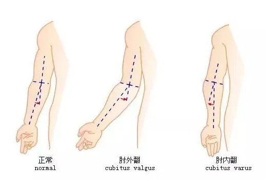 肘外翻 正常肘關節完全伸直時有一輕度外翻,男性約10°,女性約15°。這個外翻角稱為攜帶角。若這個角度增大,即前臂過於外展,稱為肘外翻畸形。