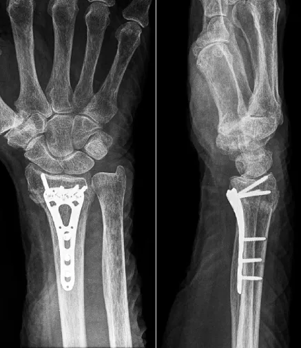 植入鋼板:將一塊金屬板固定在患者橈骨遠端的骨折處,然後使用螺釘將其固定。這個過程可以幫助保持骨折處的穩定性,使骨折得以癒合。