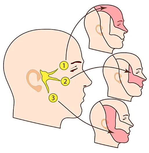 三叉神經痛位於臉部分成眼支、上顎支及下顎支,分別支配臉部上、中、下的部位(分別為第1、2、3支),最後匯聚於顱內的半月形三叉神經節,不論是物理性壓迫或病理性感染至此神經都屬於高風險族群。
