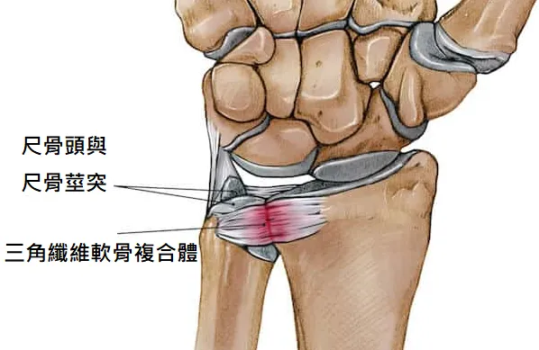 三角纖維軟骨 複合體(triangular fibrocartilage complex, TFCC) 位於手腕關節的尺側(即靠小指側),是由一群韌帶及纖維軟骨所組成,三角骨、月狀骨、尺骨、橈骨之關節銜接處沒有達到正確的排列位置,進而導致三角纖維軟骨未能在所負責之位置上,造成手腕動作方向角度產生受限、週邊肌肉神經筋膜等軟組織產生發炎、不適症狀,即為三角纖維軟骨複合體損傷。