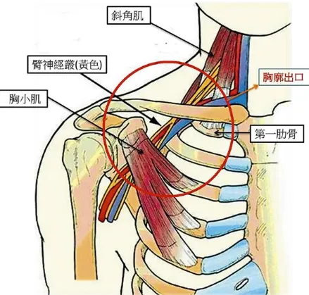 胸廓出口位於:前中後斜角肌合稱為斜角肌三角間隙、肋骨鎖骨間隙、胸小肌間隙,其中斜角肌三角是最容易被壓迫的