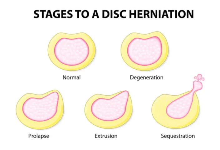 椎間盤突出症狀病變通常有以下因壓迫組織而產生之症狀以及關節角度以及關節支配之肌肉力量影響、神經症狀及壓迫範圍、椎間盤突出情況之五面向演化階段: